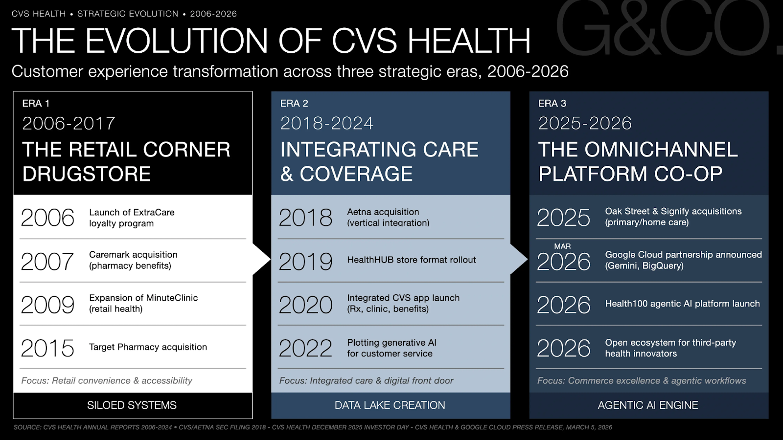 CVS Health enters 2026 operating across 185 million annual consumer touchpoints and $372.8B in FY2024 revenue — and has made a decisive architectural bet that will define its next decade: platform consolidation over unit-level optimization, collapsing three autonomous businesses into a single AI-native consumer engagement layer. The mechanism is an agentic AI infrastructure — including Agentic Twins, Google Cloud/Gemini integration, and a unified consumer app — that harmonizes clinical and transactional data across the payer-PBM-pharmacy boundary for the first time. Early results validate the thesis: integrated members show a 3–6% decrease in per-member-per-month medical costs, 97% of CVS Specialty patients prefer digital CareTeam engagement, and mid-teens adjusted EPS growth is projected through 2028. The stakes extend beyond operational efficiency — CVS is constructing a proprietary behavioral data asset designed to make it structurally indispensable to employers, payers, and the broader U.S. healthcare ecosystem.