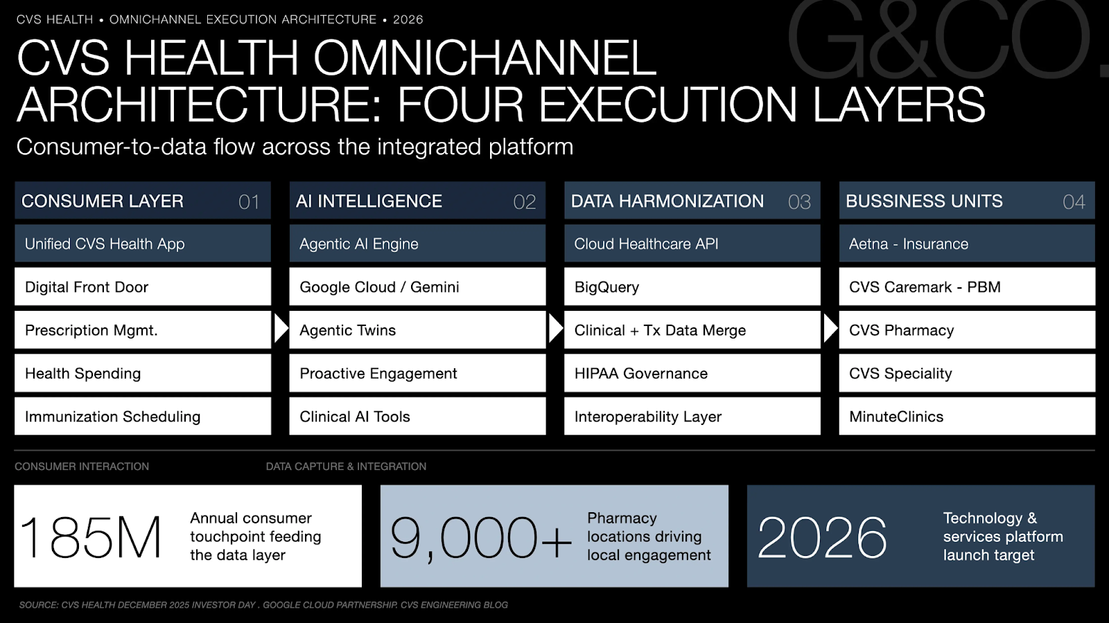 CVS Health consolidated three autonomous business units — Aetna, Caremark, and CVS Pharmacy — into a single AI-native engagement platform. Execution operated across four layers: a unified consumer app, Google Cloud agentic AI infrastructure, synthetic patient modeling via Agentic Twins, and clinician-facing AI tooling extending the engagement loop into care delivery.