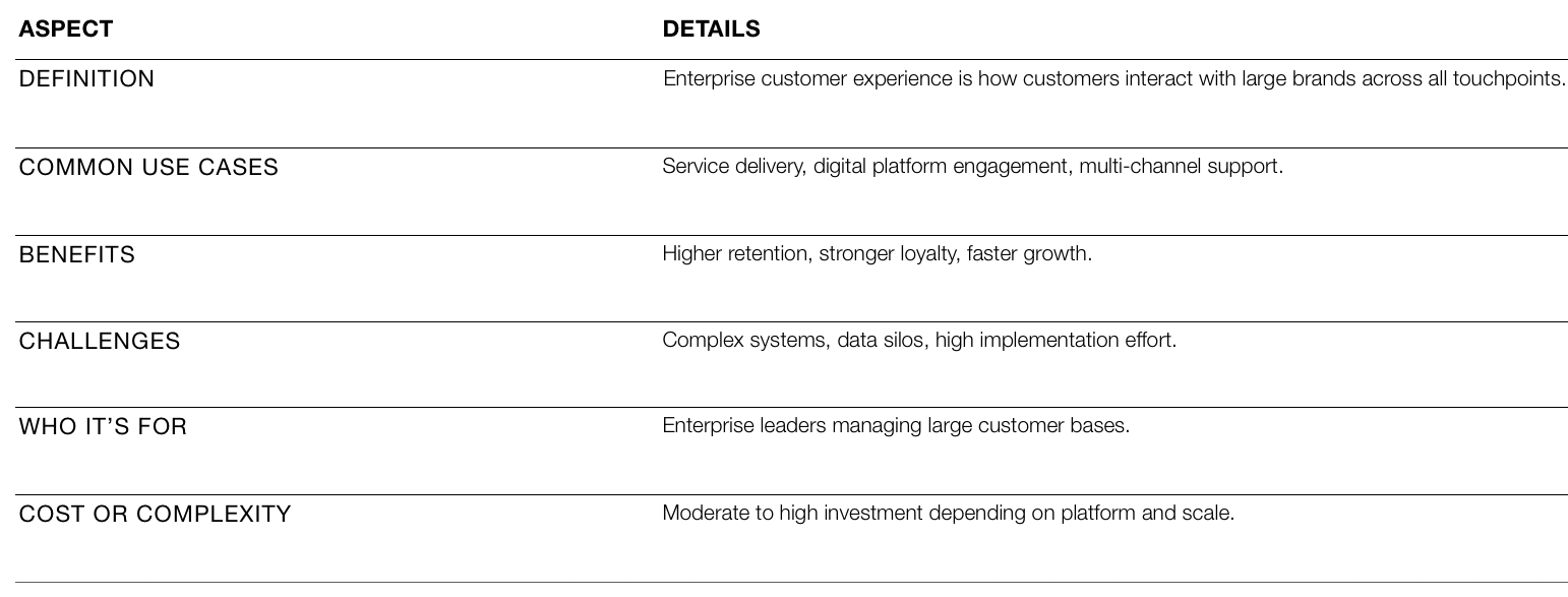 Enterprise customer experience refers to the sum of interactions a customer has with a large organization across digital and physical channels. It covers service, product use, digital platforms, and communication. Strong enterprise customer experiences create consistency and value at scale, ensuring each touchpoint builds trust and loyalty.
