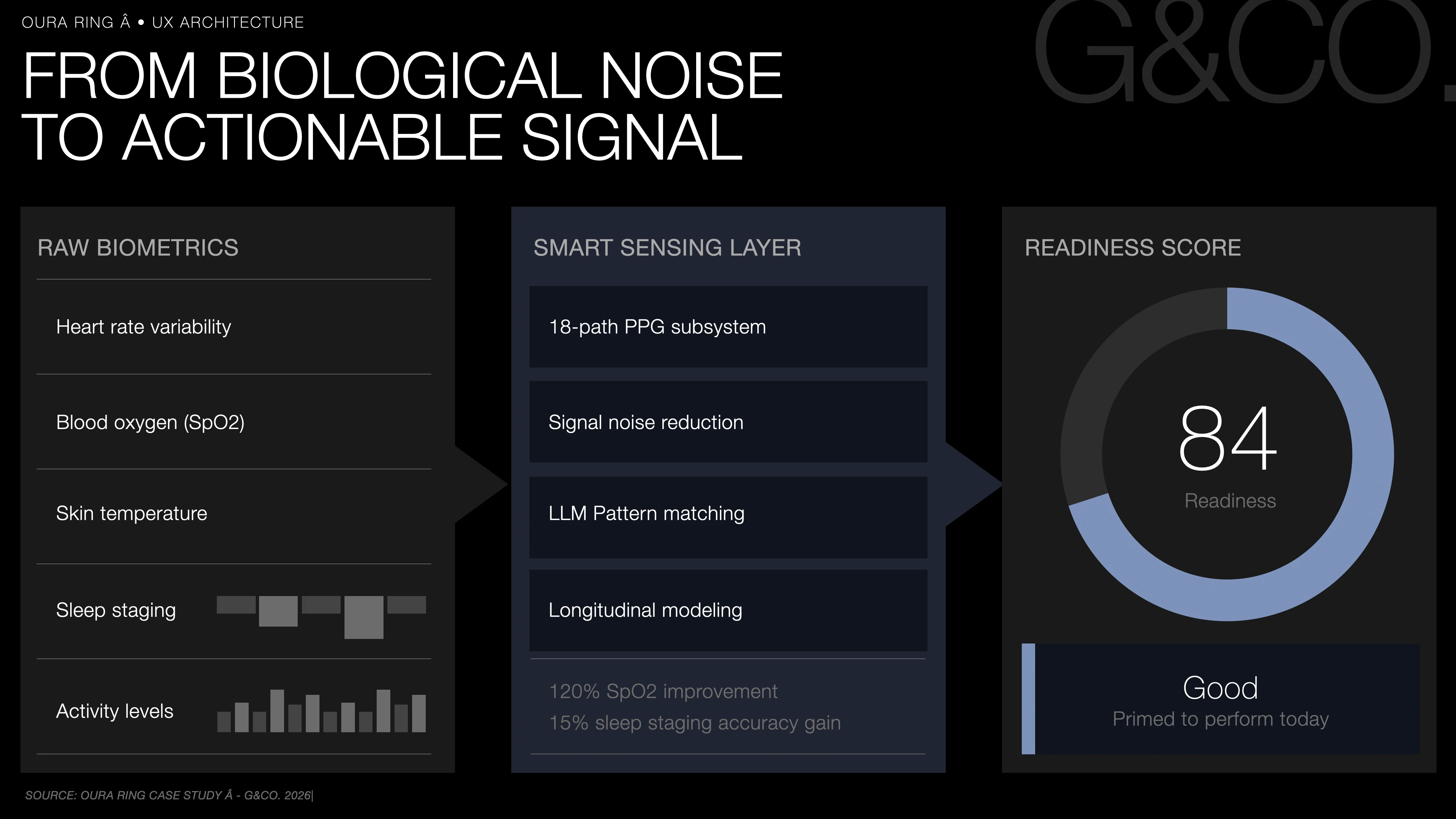 The Oura trajectory identifies a repeatable enterprise pattern: when a technology becomes commoditized, value migrates to the interpretive layer and the aesthetic identity. For large-scale organizations, this suggests that "digital transformation" is not about the data collection itself, but about the UX-led translation of that data into a user’s daily operating rhythm.