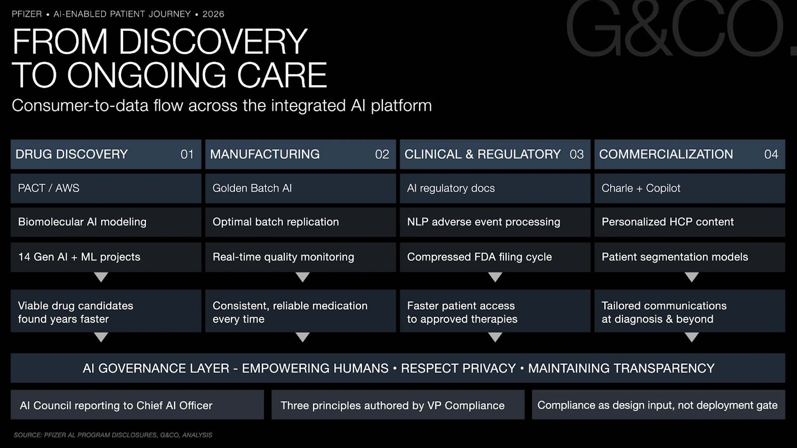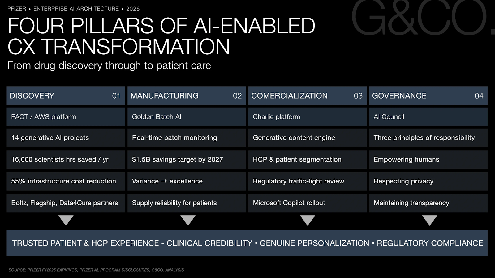 Pfizer's AI deployment spans the full pharmaceutical experience journey: the PACT/AWS discovery infrastructure generates the clinical evidence that underpins credible HCP communications; Golden Batch manufacturing AI ensures the drug quality consistency that defines the patient's therapeutic experience; Charlie's generative AI platform personalizes and accelerates compliant content delivery to healthcare providers and patients; and an enterprise-wide Microsoft Copilot rollout ensures that every person touching the patient or HCP experience has AI capability embedded in their workflow.