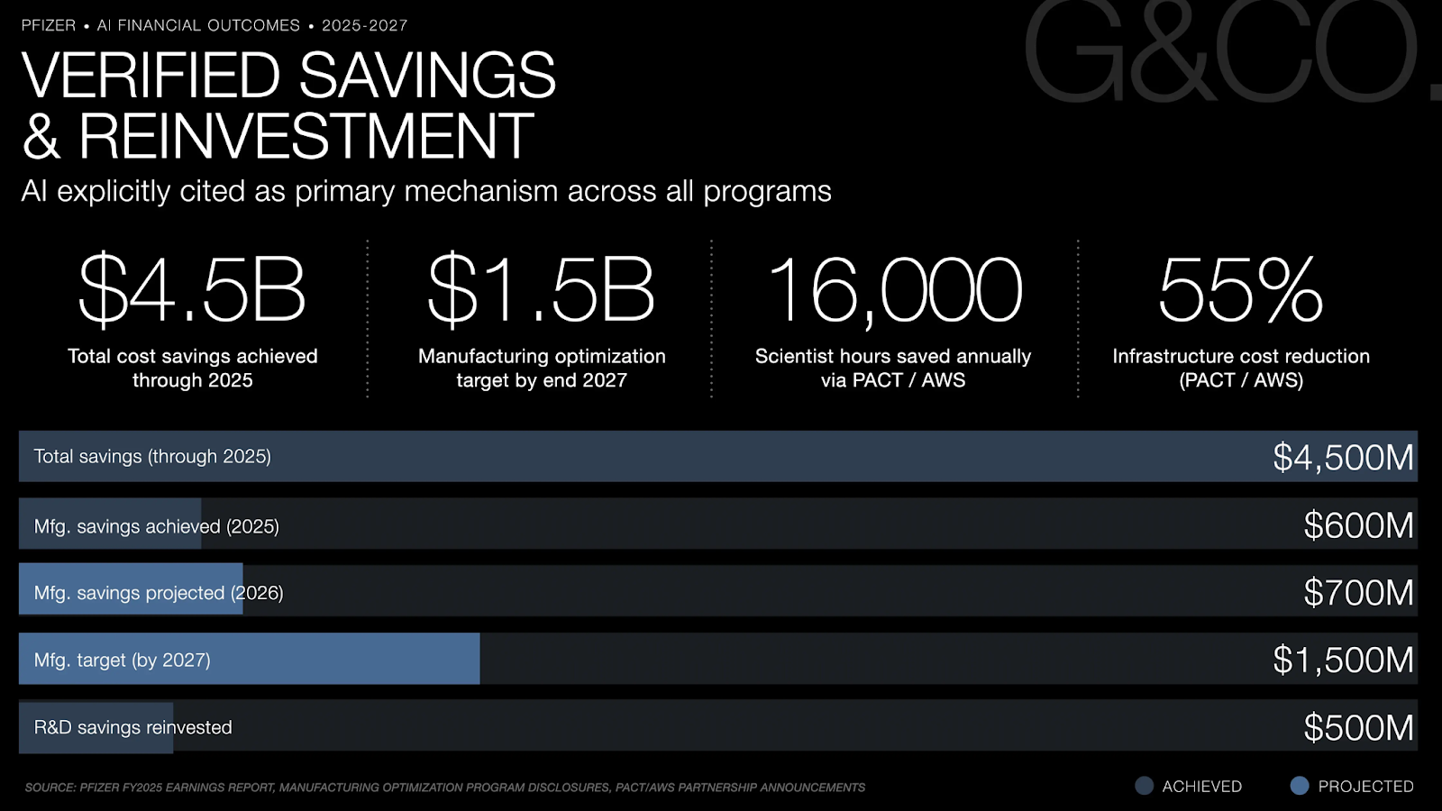Pfizer achieved approximately $4.5 billion in total net cost savings through 2025, with AI explicitly cited as a primary mechanism. The Manufacturing Optimization Program is on track to deliver $1.5 billion in savings by the end of 2027, with $0.7 billion projected for 2026. The PACT/AWS collaboration saves 16,000 scientist hours annually and reduces infrastructure costs by 55%. $500 million in R&D savings have been reinvested directly into the pipeline.