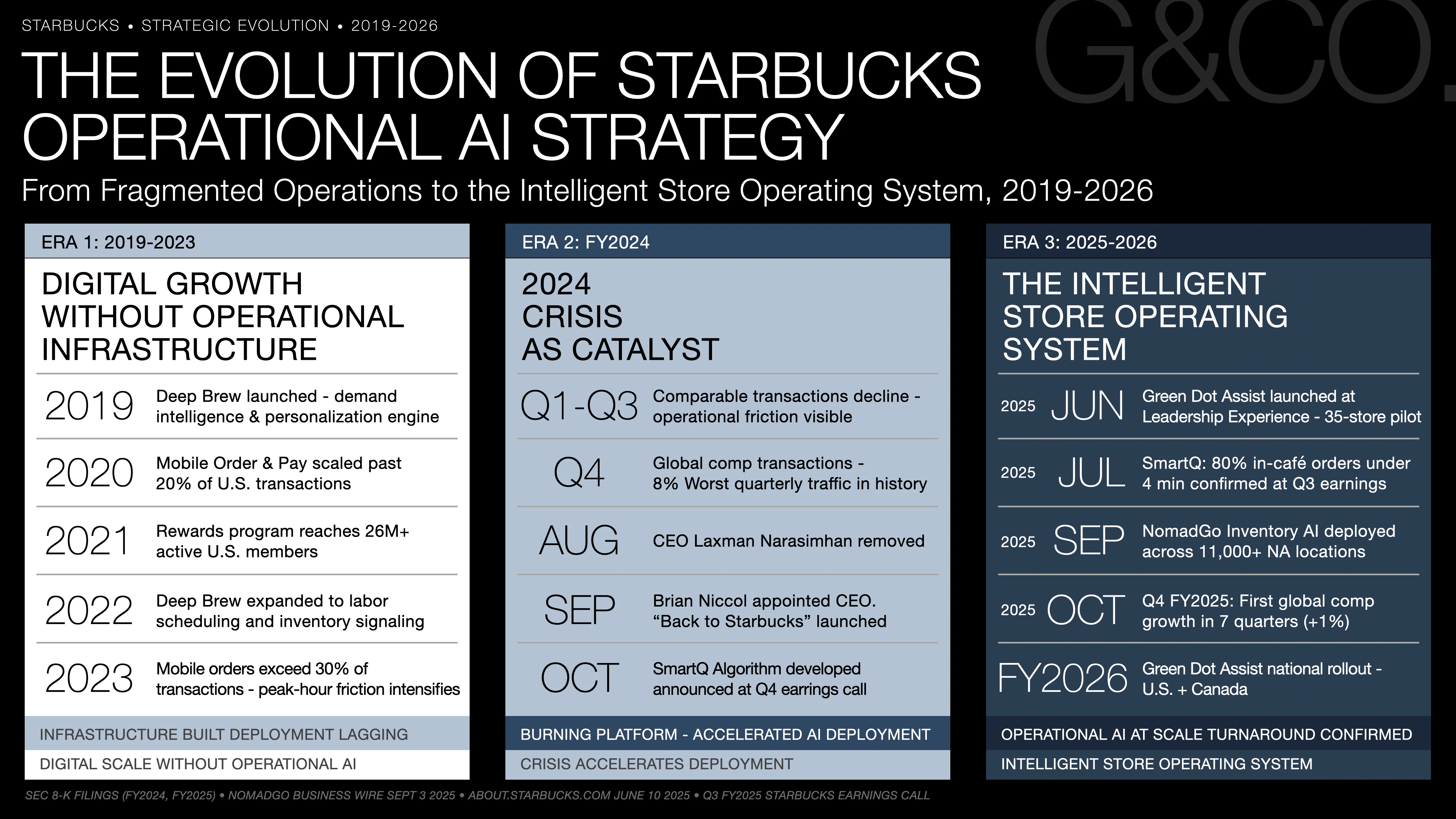 Starbucks operates 40,000+ stores across 80+ markets and generated $37.2 billion in FY2025 revenue, yet by FY2024, years of unchecked mobile order growth had transformed its coffeehouses from destinations into logistics bottlenecks. The company's response is a Starbucks case study in operational re-architecture: deploying a layered store operating system, Deep Brew (demand intelligence), SmartQ (order sequencing), Green Dot Assist (generative AI barista companion), and NomadGo Inventory AI (computer vision counting), not to automate the Starbucks experience, but to machine-orchestrate the logistics that were preventing it. The thesis is architecturally precise: every task absorbed by AI is a task returned to human craft. When SmartQ is deployed, 80% of in-café orders are now completed in under four minutes; NomadGo counts inventory 8x faster at 99% accuracy across 11,000+ North American locations; and the turnaround delivered its first global comparable store sales growth in seven quarters in Q4 FY2025. This is not a Starbucks digital transformation story, it is a blueprint for how operational AI at retail scale resolves the fundamental tension between digital convenience and human connection.