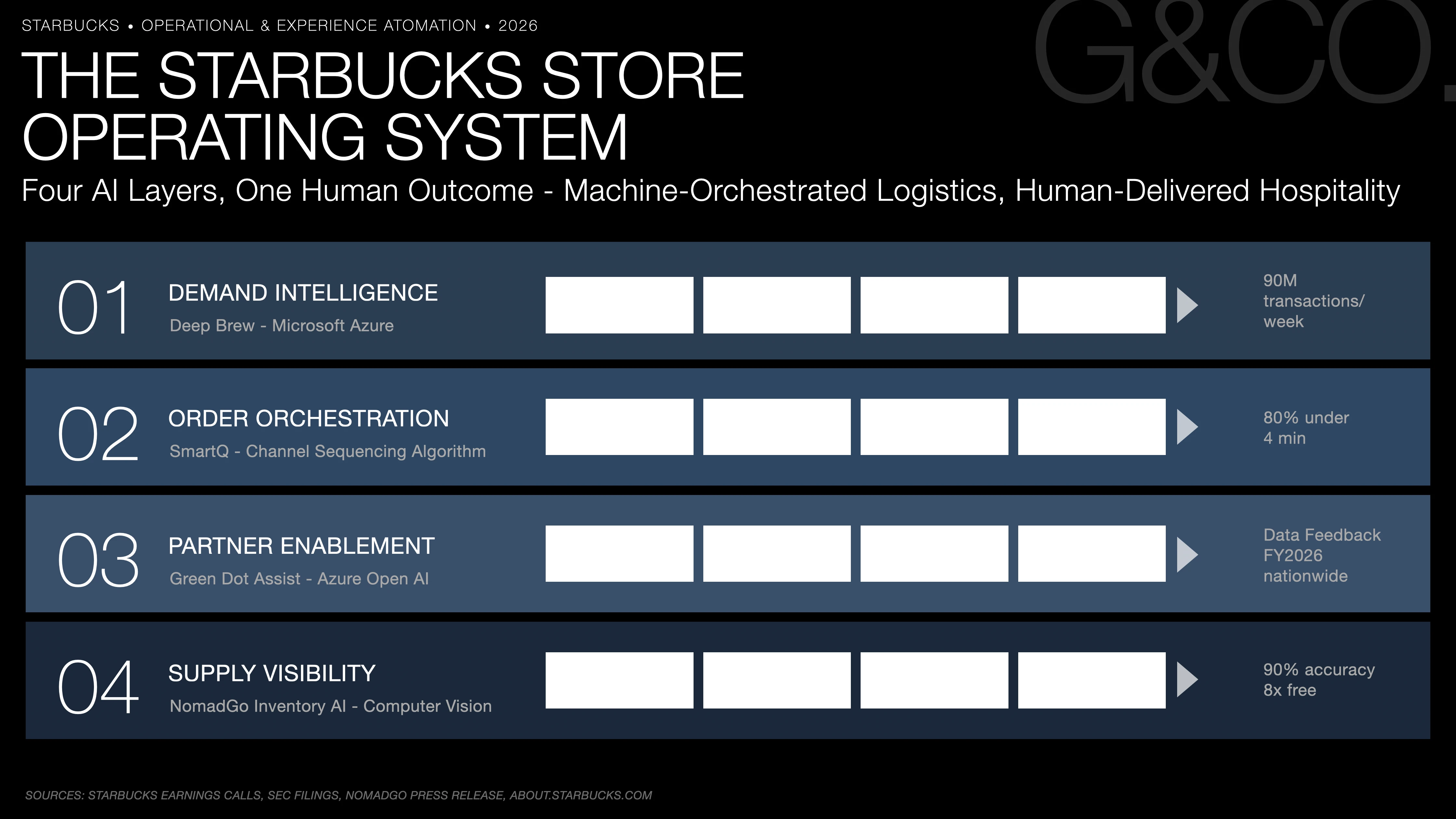 The execution of Starbucks' operational AI strategy operates across four distinct but interdependent layers, each targeting a specific point of friction in the store operating model, and each designed to return barista attention to the customer rather than to administrative process.