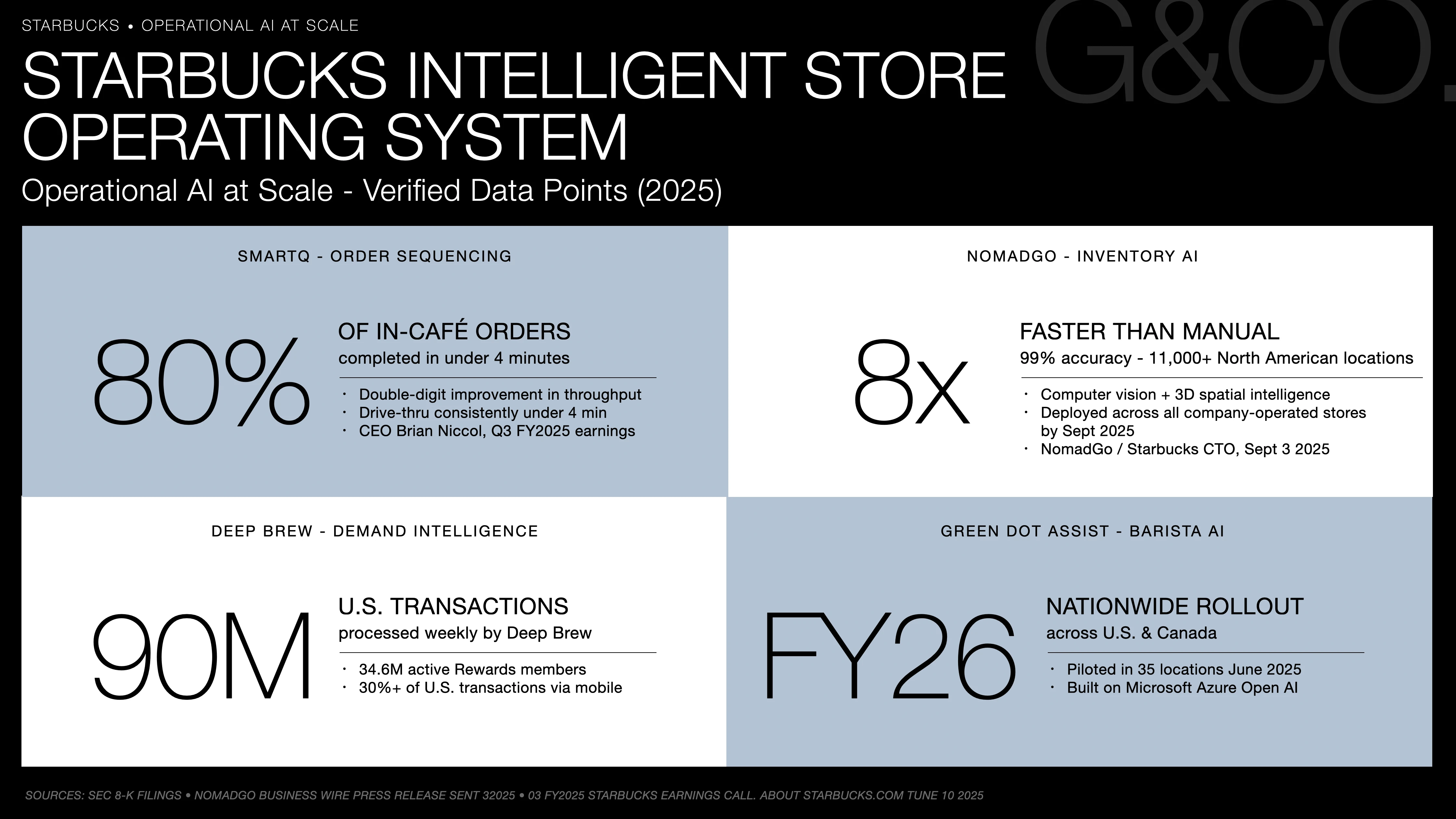 Starbucks operates a layered store operating system built on four AI platforms: Deep Brew (demand intelligence and personalization, running on Microsoft Azure), SmartQ (order-sequencing algorithm synchronizing café, drive-thru, and mobile channels), Green Dot Assist (generative AI barista companion built on Azure OpenAI, piloted June 2025), and NomadGo Inventory AI (computer vision counting deployed across 11,000+ North American locations by September 2025). Each layer handles a specific operational task so that baristas can focus on craft and customer connection.