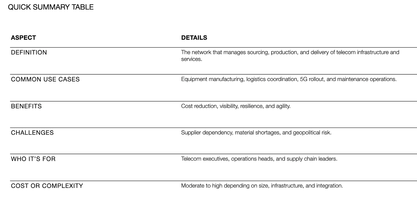 This article explains how the supply chain in the telecommunication industry operates, what drives risk, and how leaders can strengthen their telecommunication supply chain strategy. It is written for directors, VPs, and heads of enterprise telecom companies. Readers will gain clear answers, strategic insight, and actionable steps to improve supply chain operations.