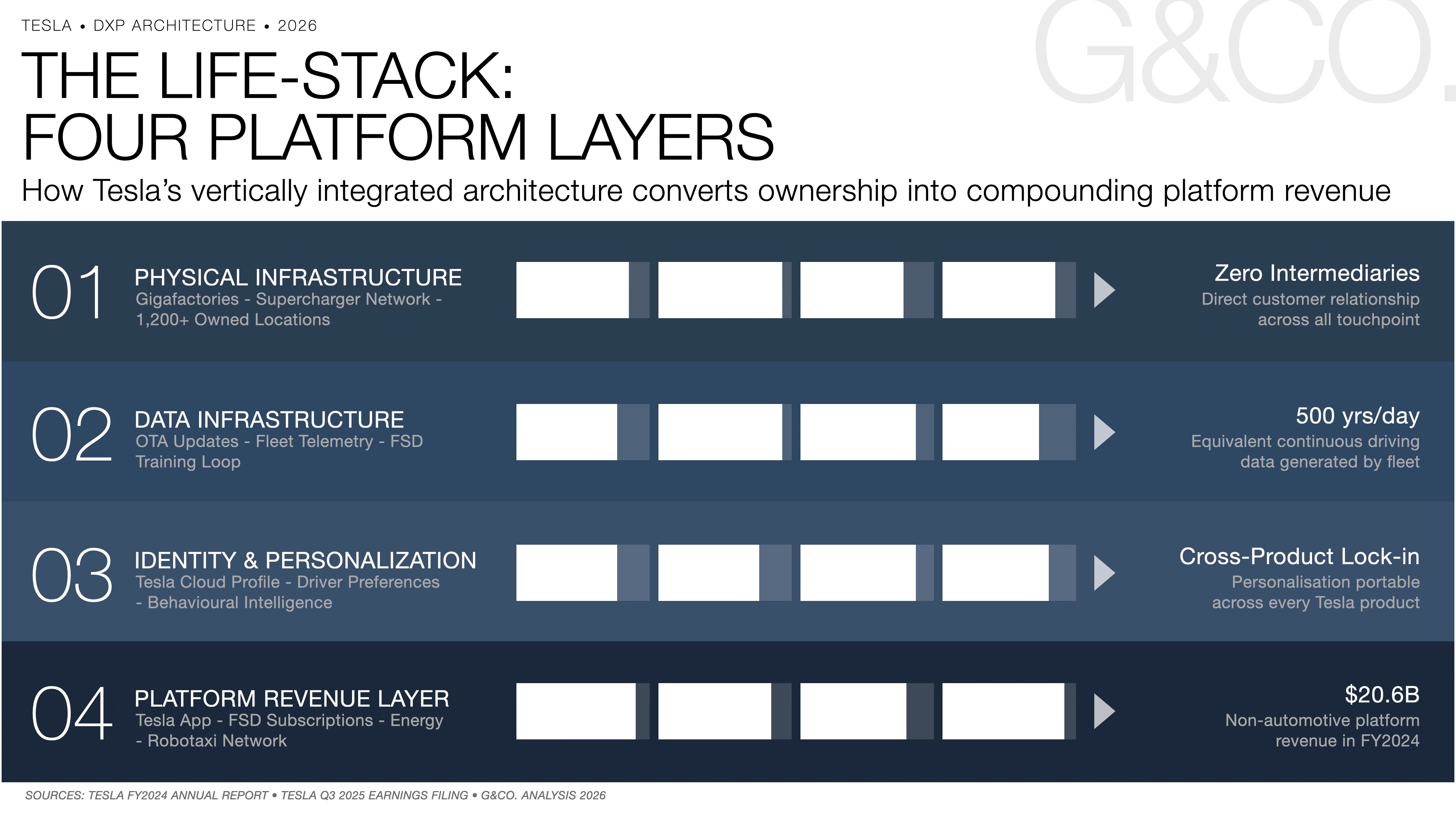 The Life-Stack has five operational layers. The physical infrastructure layer comprises the Gigafactories, the Supercharger network, and the service and delivery locations, the capital-intensive foundation that competitors cannot replicate through vendor selection. The data infrastructure layer is the OTA update system, fleet telemetry, and the FSD training loop that processes the equivalent of over 500 years of continuous driving data per day from Tesla's global fleet. The identity layer is the Tesla cloud profile, the personalisation engine that stores every driver preference and recreates a customer's environment in any Tesla they access. The platform layer is the Tesla app, which by 2025 managed vehicle, energy, grid participation, and autonomous mobility through a single authenticated interface. The revenue layer is what the four layers below enable: FSD subscriptions, energy services, Supercharger fees, insurance, and the robotaxi network that activated in June 2025.
