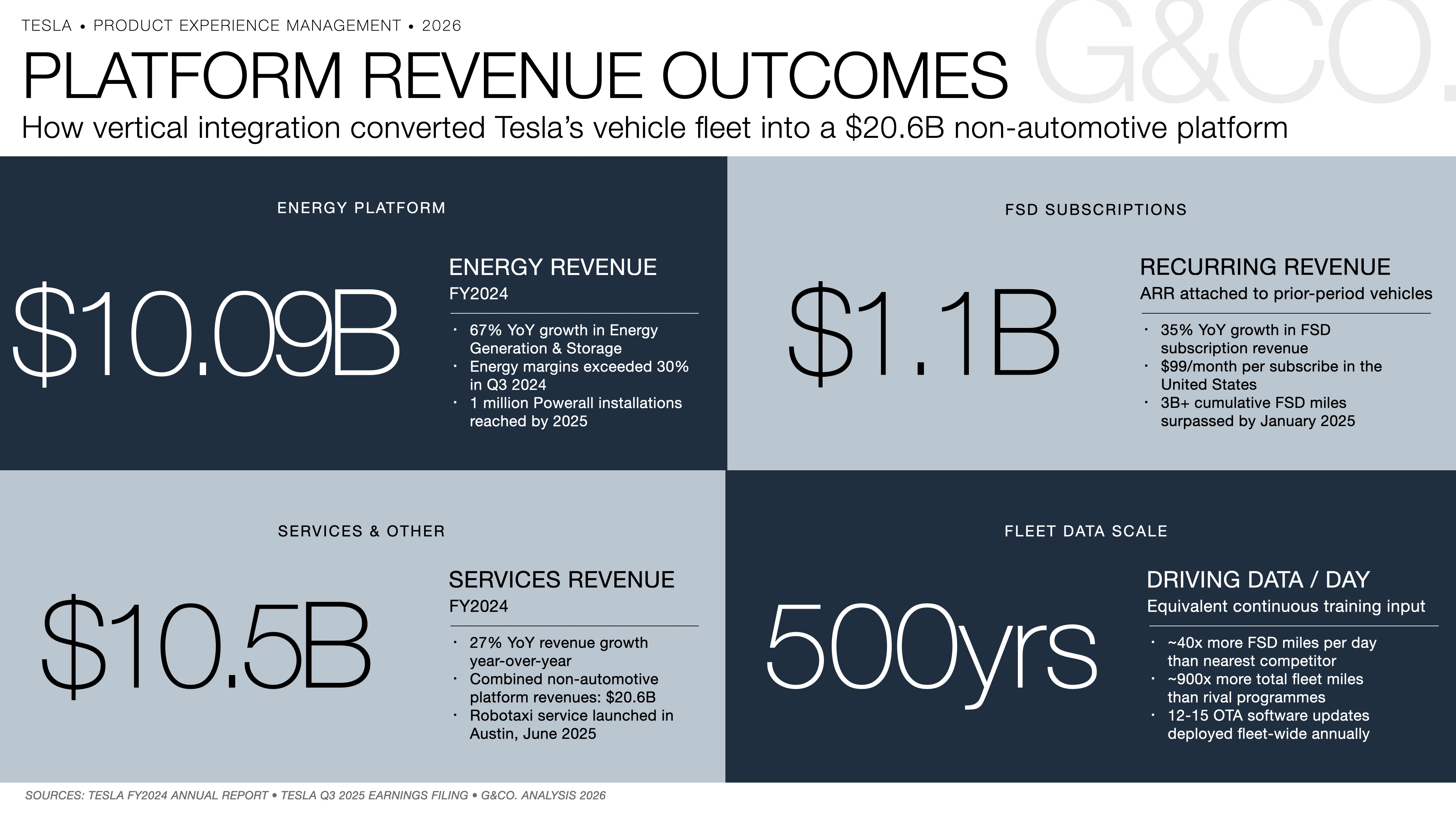 The financial results of Tesla's product experience management strategy are visible in the growth of its non-automotive revenue streams. Energy Generation and Storage revenues reached $10.09 billion in FY2024, a 67% year-over-year increase, with energy margins exceeding 30% in Q3 2024. Services and Other revenues reached $10.5 billion, up 27% year-over-year. FSD subscriptions generated $1.1 billion in recurring revenue, up 35% year-over-year, attached to vehicles delivered in prior periods. Combined, the platform layers represented over $20.6 billion in FY2024 revenue. The robotaxi service launched in June 2025 introduces a third platform revenue layer, and the owner fleet participation model expected in 2026 will activate every FSD-equipped vehicle sold to date as a potential commercial asset.